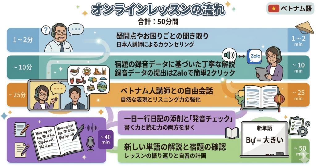 ユーホックでは、初級レベルにおいてベトナム人講師と日本人アシスタントによるW指導体制を採用しています。発音や声調といった難関部分は、口の中の動きまで丁寧に解説しながら、何度でも正しく矯正します。