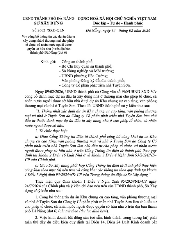 - いつ?: 2026年2月13日付、ダナン市建設局発行の公文書「第2662/SXD-QLN号」により、特定のプロジェクトが外国人所有可能物件として正式に公表されました 。