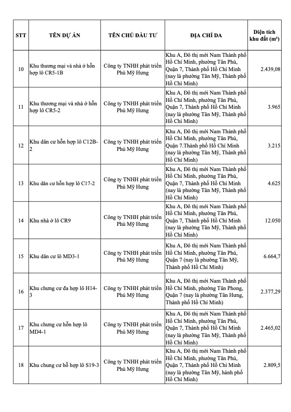| 10 | Khu TM & nhà ở hỗn hợp (Lô CR5-1B) | Công ty TNHH phát triển Phú Mỹ Hưng | 7区(旧タンミ街区) | 2,439.08 |
