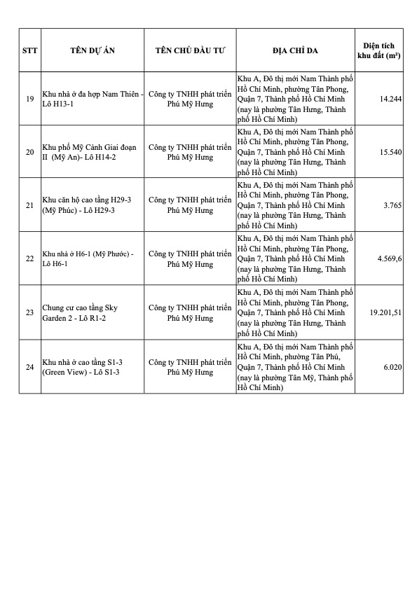| 23 | Sky Garden 2 (Lô R1-2) | Công ty TNHH phát triển Phú Mỹ Hưng | 7区(旧タンフォン街区) | 19,201.51 |