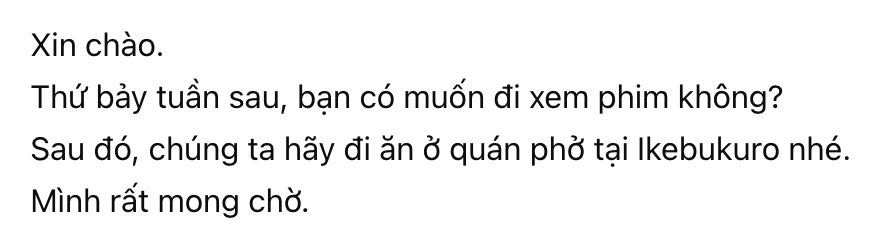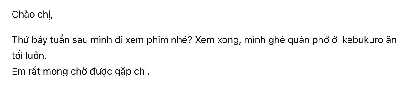 “Chào chị, thứ bảy tuần sau mình đi…”(親しみやすく、かつ敬意がある自然な表現)