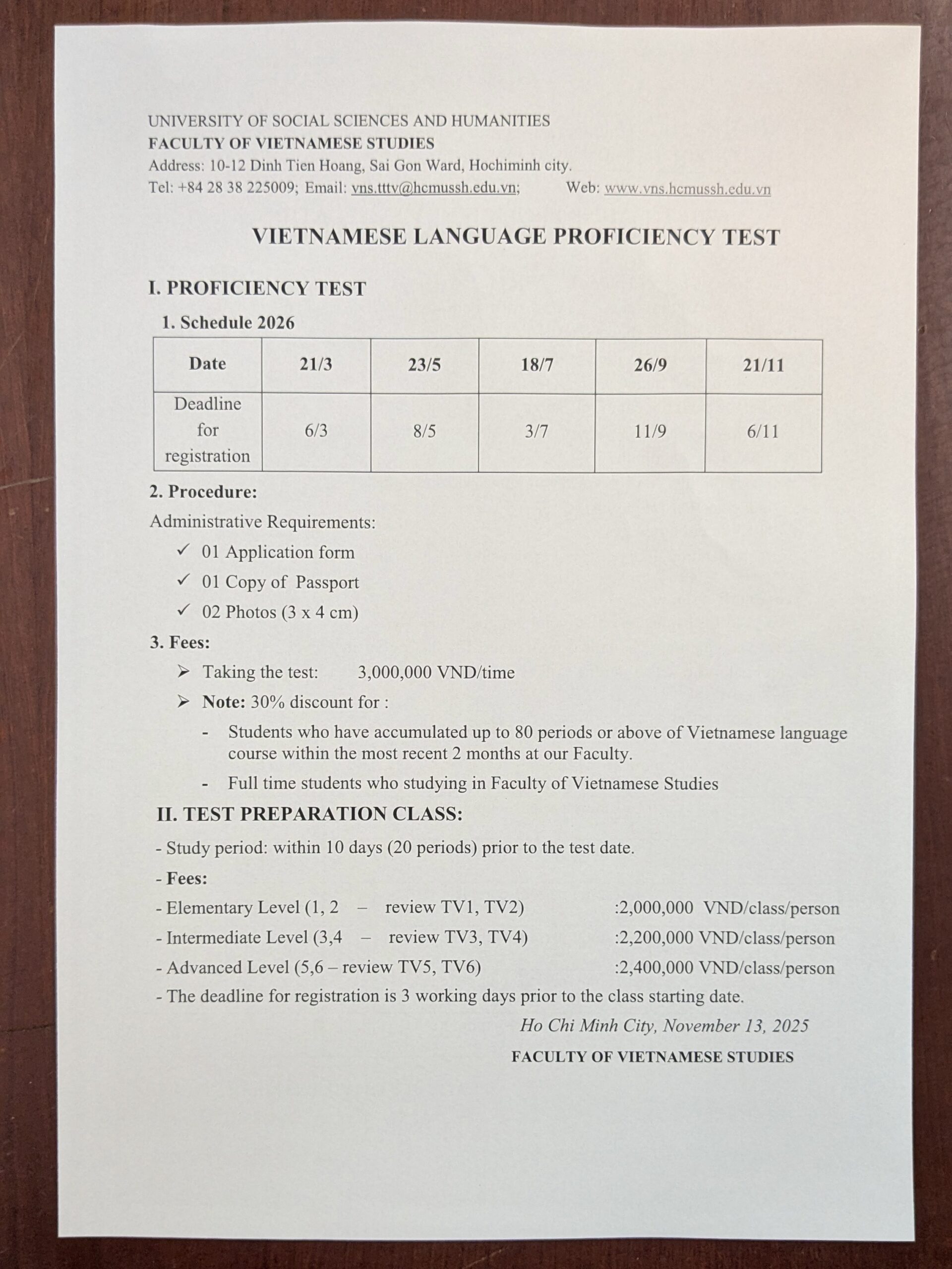 受験料は1回につき3,000,000VNDです。ただし、同大学のベトナム語学部で直近2ヶ月以内に80コマ以上の授業を履修している学生や、同学部のフルタイム学生には30%の割引特典があります。また、試験の10日前からは、初級(レベル1, 2)から上級(レベル5, 6)まで、レベル別の試験対策クラスも開講されます。2,000,000〜2,400,000VNDの追加費用で集中的に復習ができるため、合格・スコアアップを確実に狙いたい方には非常に有効な選択肢です。
